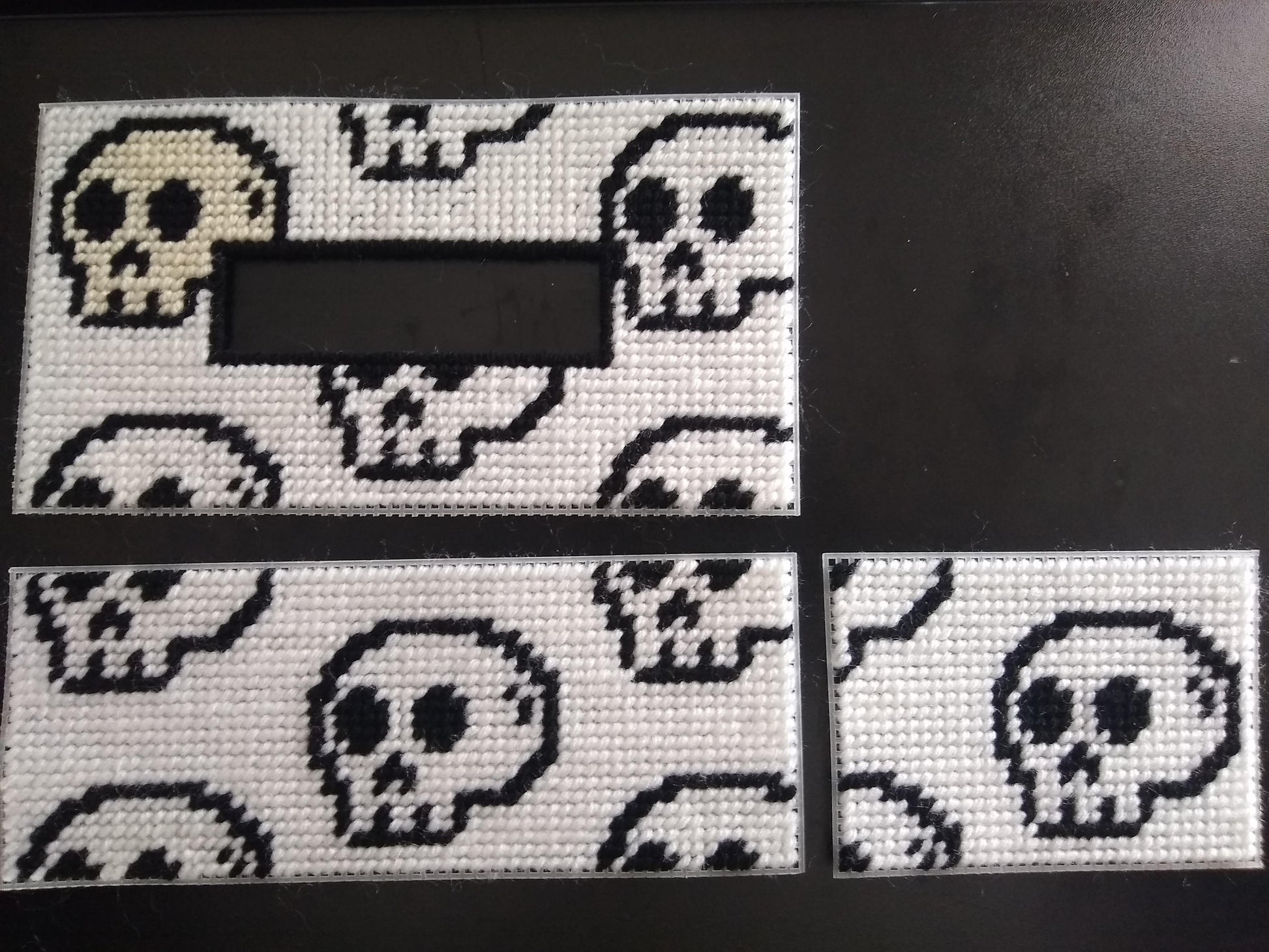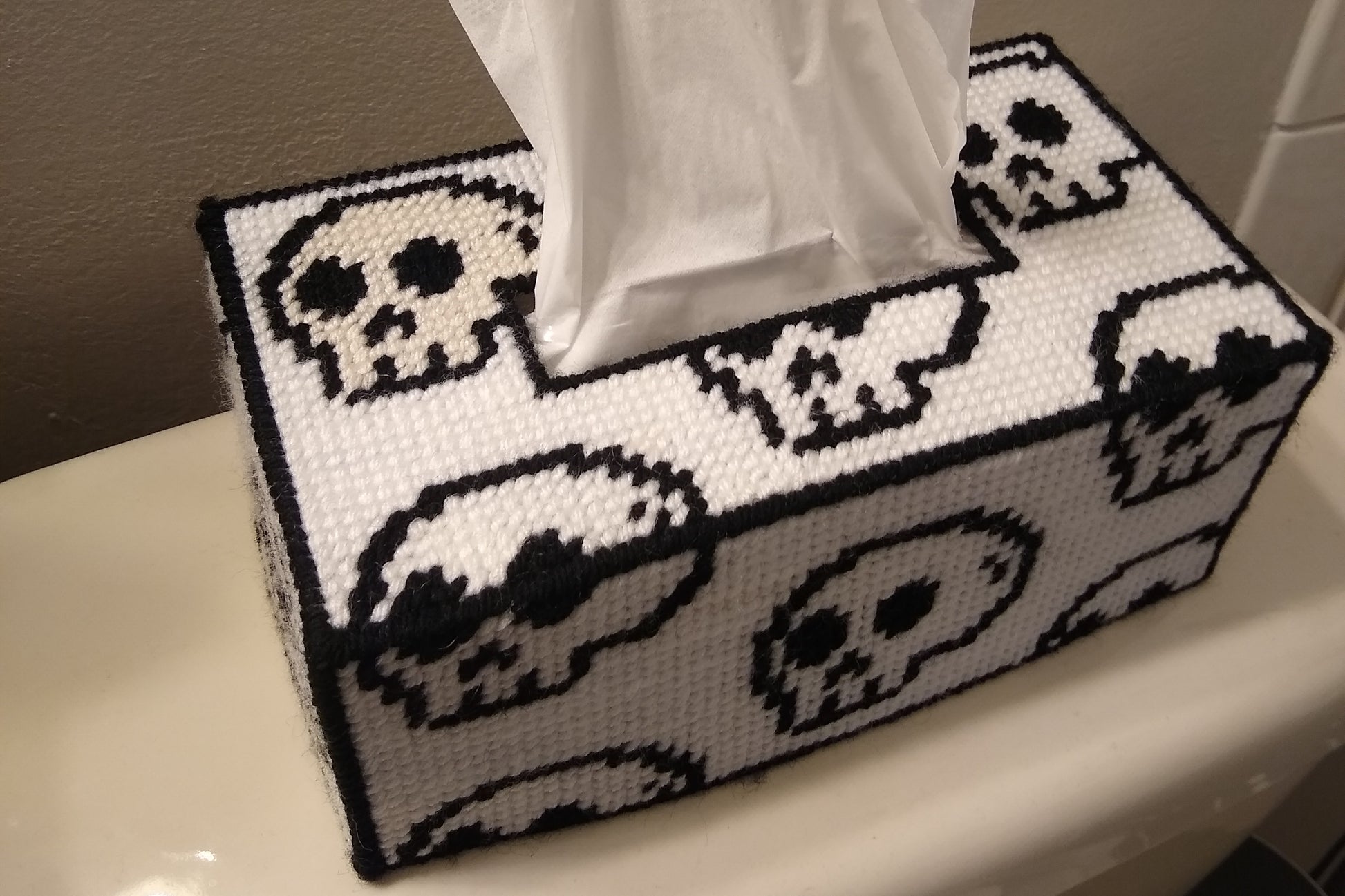 The world needed a skull tissue box cover (because, you know - skulls), and when I couldn't find a decent one anywhere, an idea was born. Made with plastic canvas, this cover shows how cool sneezing can be.